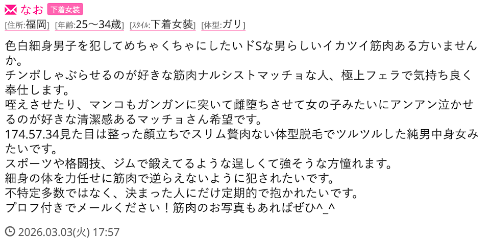 今月13日(金)から八幡西区黒崎のホテルに2泊する、いやらしい下着にウイッグ(メイクなしマスクあり)の淫乱マンコです。夜遅い時間、夜中でもホテルに来てくれて蒸れた太いチンポで変態ファックしてくれる、20代から40代ぐらいまでのお尻や太ももがムチムチ大きいガッチリ骨太体型からガチムチ太めな方いませんか?特に汚れた作業着や下半身にぴっちりしたタイトなもっこりスーツ、ジャージやシャカシャカの上下ウイブレの方、男臭い体育会系の方とか大歓迎です。良ければ濃いのたっぷり生膣の中に出して孕ませてください。ゴムファックでしたらゴムの中の濃い液をマンコの中に塗り込んで妊娠させて欲しいです😅165*68*49