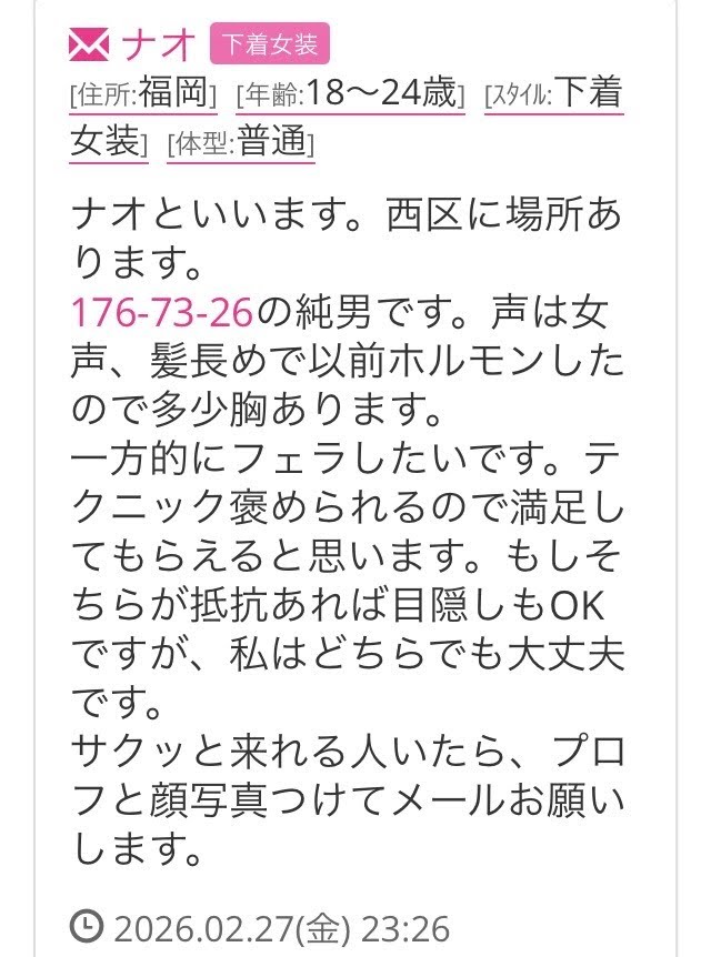 大分市内に住む完全女装の明菜と言います。