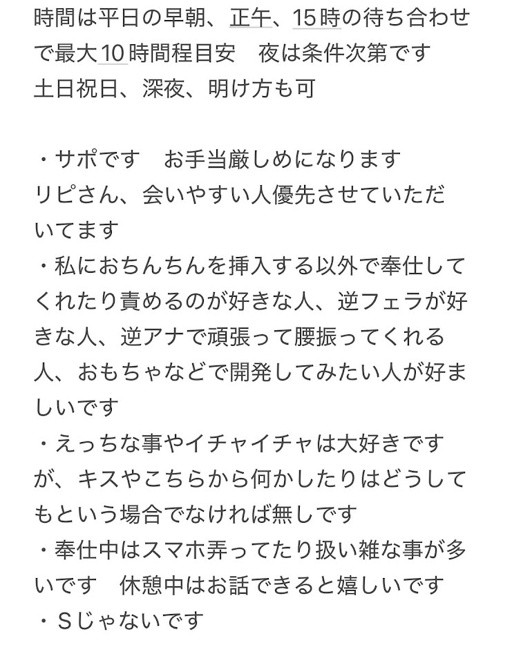 170 60 30代半ば。外見は中性的。カジュアルスタイル。メイクうすめ。写真交換一切してません!予定決めてホテルで会えるペニクリおしゃぶりあい好きな人。アナルは逆アナルのみ大丈夫だと思います。Mよりな人が良いかも。たっぷりミルク飲ませたいな。条件ありの募集。詳細はメールで。年上希望です。紳士なガッチリまでの方よろしくです。