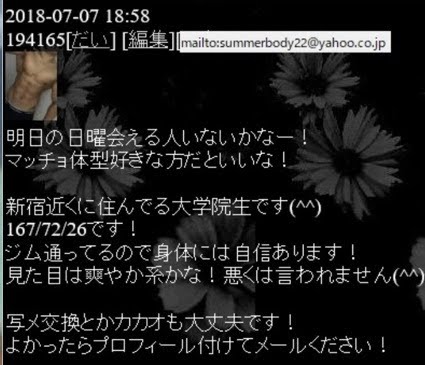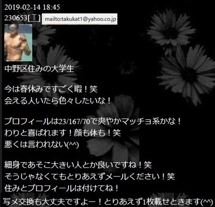 ハンドル名たく(以前は、りょう)は、一昔前から魔裟斗似の大学生とか大学院生とか言って年齢サバ読んでいるが年齢40代位、昔投稿していたサングラス顔を見ても20代には見えず禿げも始まりシワクチャ顔。