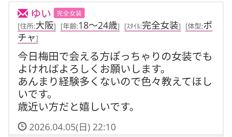 興味がある完女装さんは、プロフ、写メを付けてメールください。