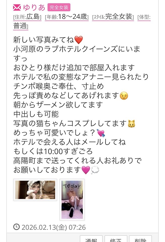 🔥神🖐竜也🔥、ななみ、まみ、ひめか等名前を変えて🌟 場所代を請求 立派な援助交際です!広島近辺のホテル、安佐北区倉掛郵便局付近に注意